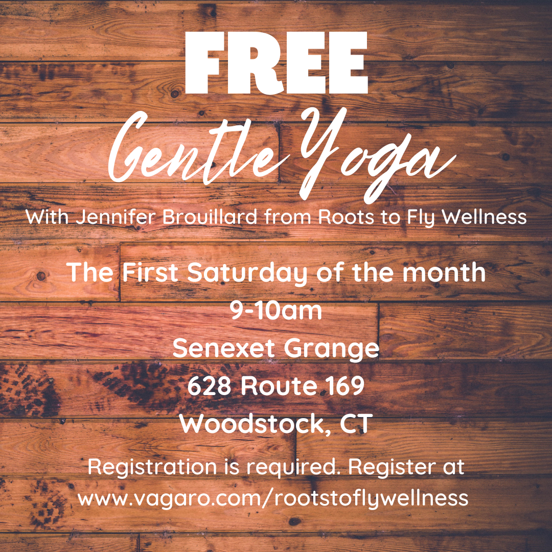 Join Jennifer Brouillard of Roots to Fly Wellness for a monthly FREE Gentle Yoga Class at the Senexet Grange on the First Saturday of the month. The movement will be extra slow and breath work and meditation will be highlighted as a way to learn how to pause and slow down. We will stretch our bodies and minds and work to release what is no longer serving us. I would be honored to hold space for you. All are welcome so come as you are and take what you need! Lots of modifications will be offered. Blocks, blankets, straps and chairs are all available to borrow on a first come basis. Extra mats will be available as well.